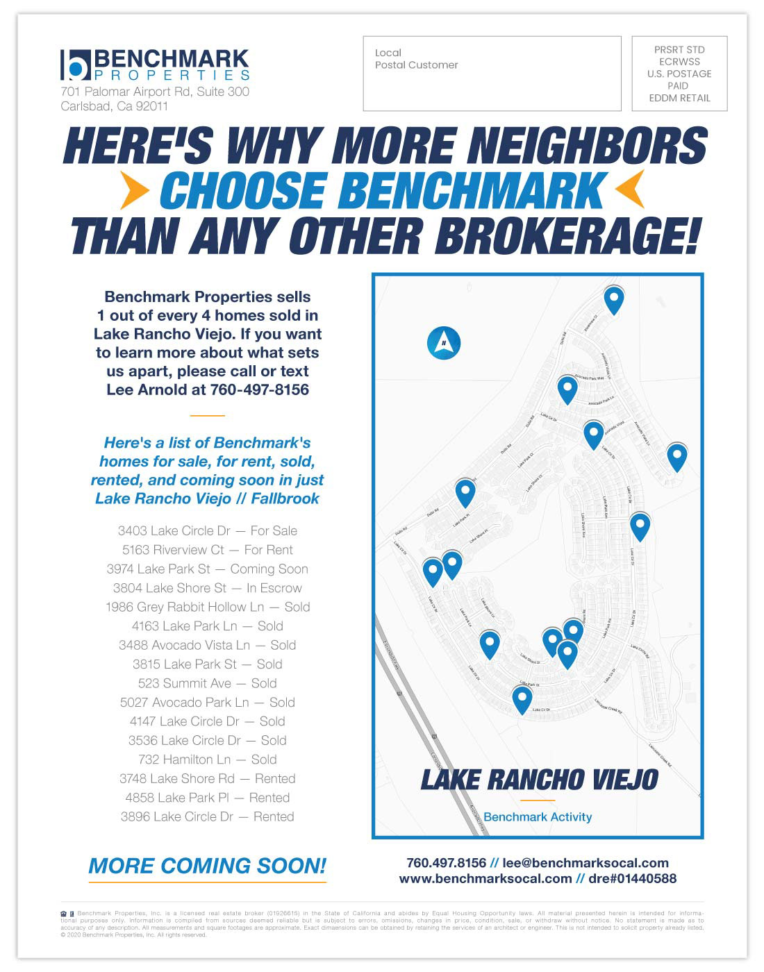 "Benchmark Properties is a team of experienced, licensed real estate agents serving the San Diego area. With a proven track record of getting results quickly and a direct line of communication at all times." (text source: Benchmark website)