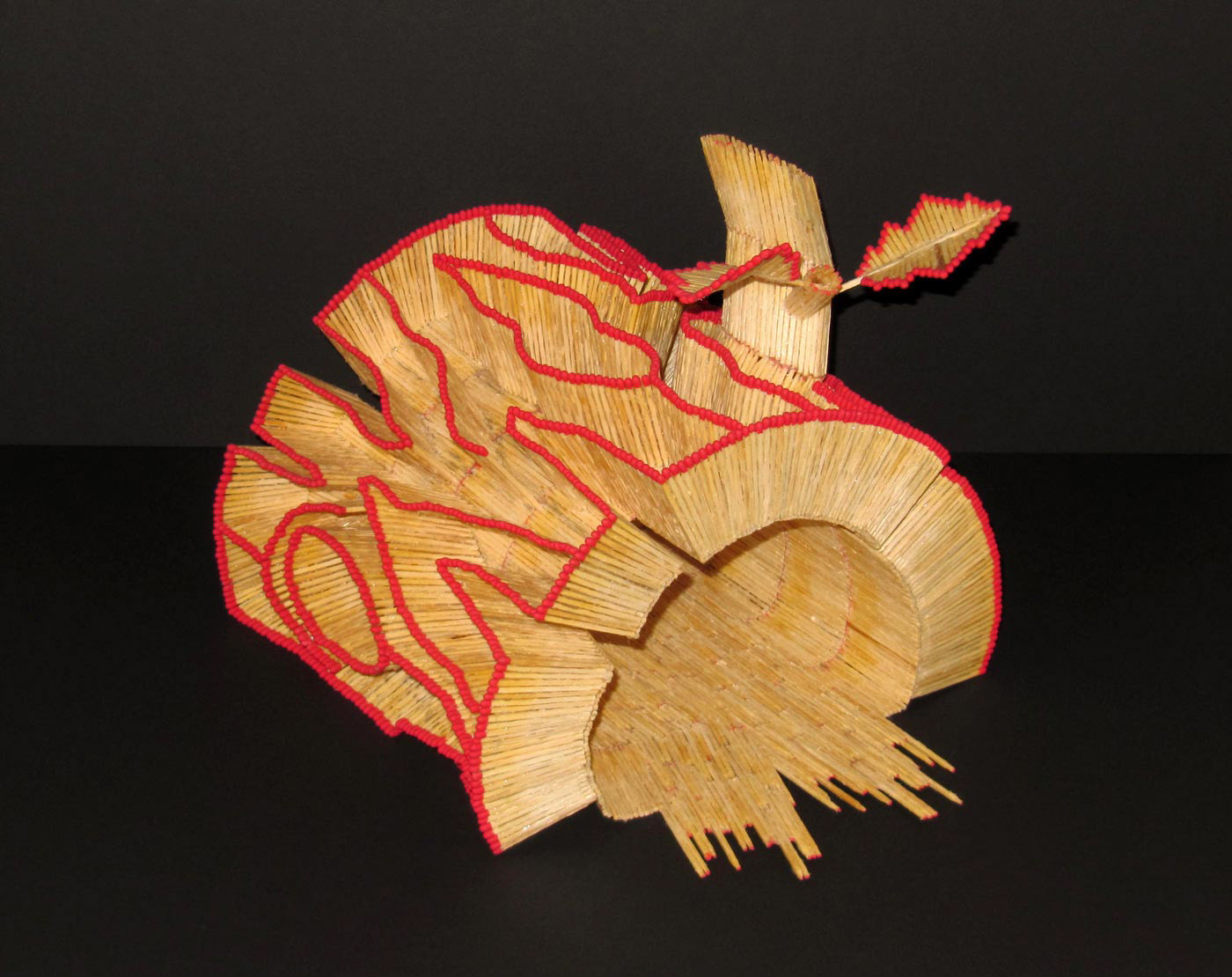 Project was to choose a man-made object, come up with a sculpture that told an environmental message, and build out the sculpture using only that man-made object. Chose matches in a way that would form a tree stump. Hot glue and around 2,000 matches.